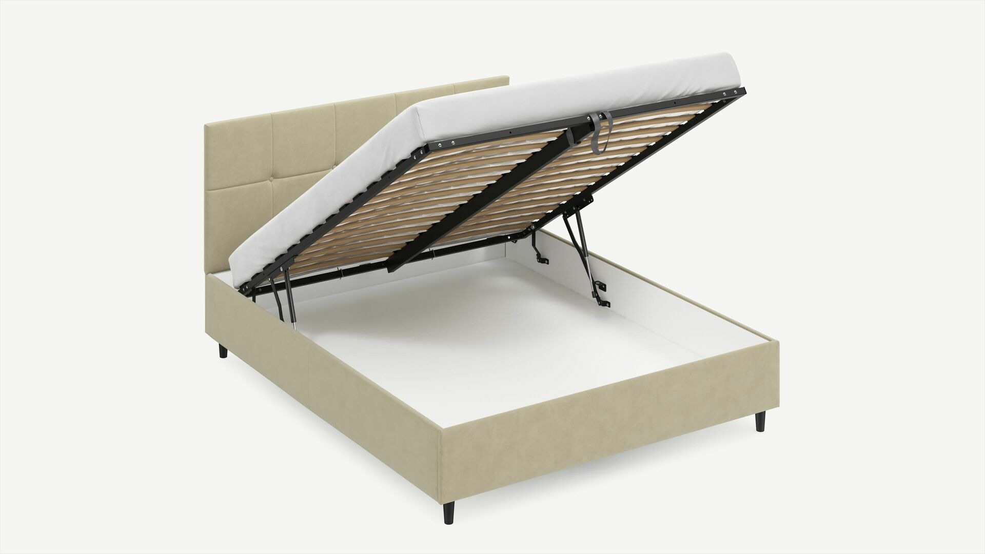 • Скрытая под основанием вместительная емкость без внутренних перегородок позволяет использовать всю площадь подкроватного пространства для хранения вещей.