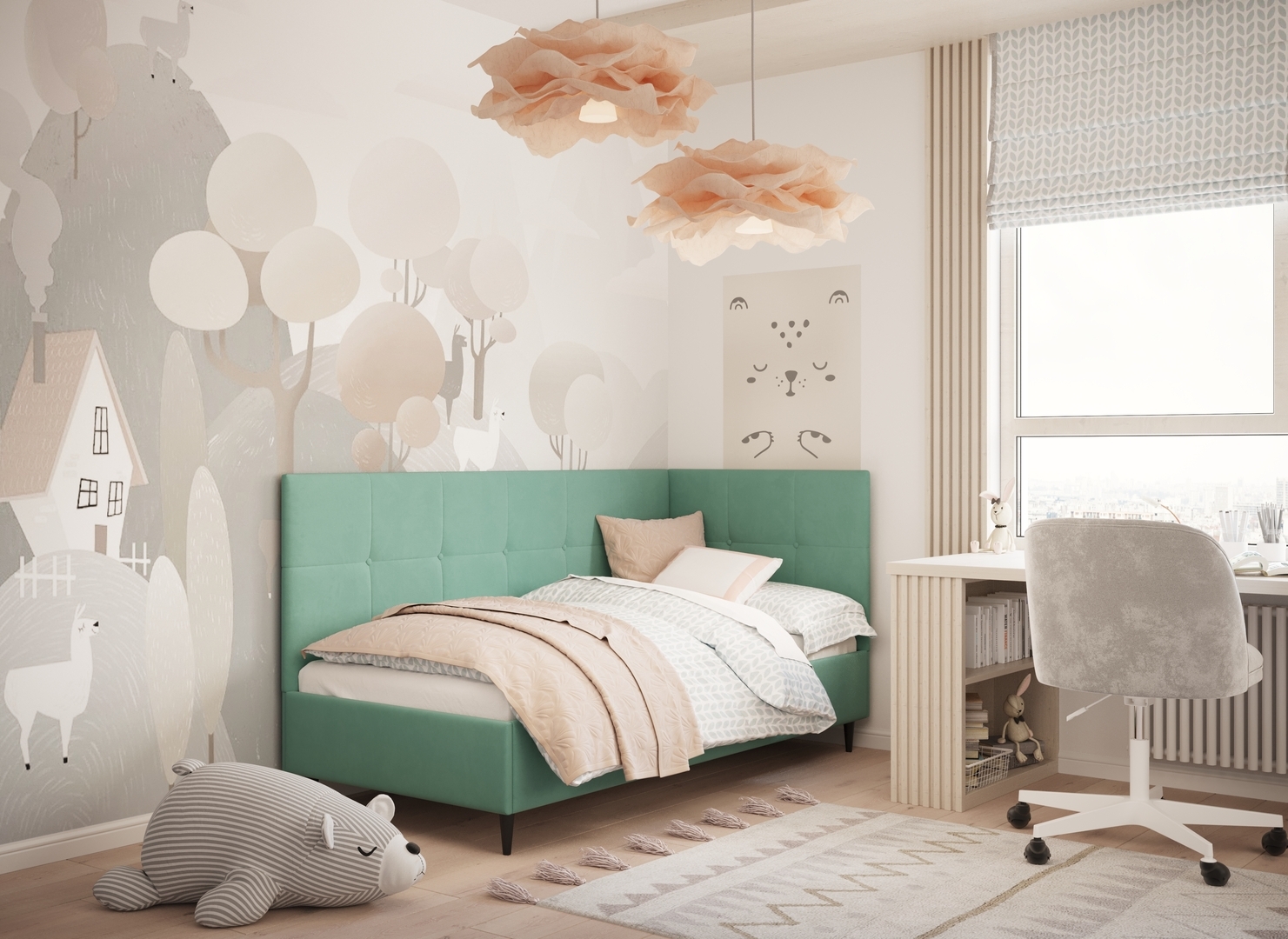 Угловая односпальная кровать MOON FAMILY 1261 с мягкой спинкой и изголовьем создаст в Вашей спальне ощущение уюта. Крупная квадратная стежка привносит в интерьер графических акцентов, а вставка из пуговиц наполняет пространство ощущением домашнего тепла.